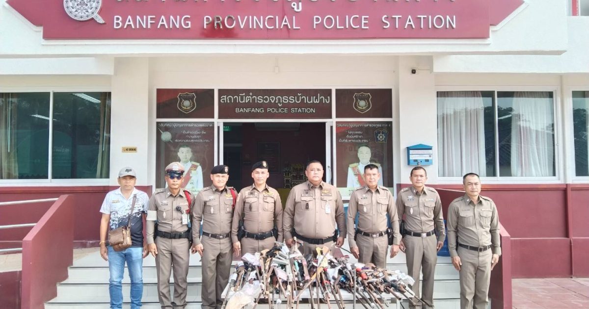 พ.ต.อ.อิทธิพล เนตรไธสง ผกก.สภ.บ้านฝาง พ.ต.ท.เทียรไชย ชาวส้าน รอง ผกก.(สอบสวน) สภ.บ้านฝาง พ.ต.ท.ประสาร ฉิมพลี สวป.สภ.บ้านฝางพ.ต.ท.สุดใจ กงทอง สว.(สอบสวน) สภ.บ้านฝาง พร้อม คณะกรรมการทำลายอาวุธปืนของกลาง ตามคำสั่ง ภ.จว.ขอนแก่น ที่ 771/2566 ลง 3 ตุลาคม 2566
