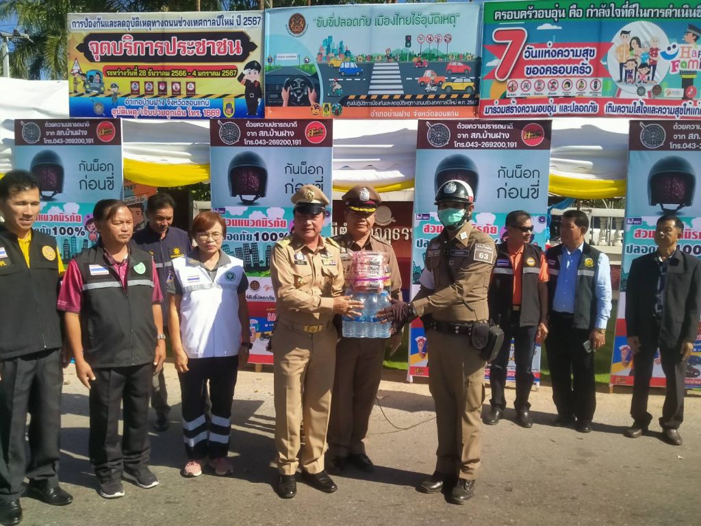 พร้อมด้วย ว.30 สภ.บ้านฝาง ข้าราชการตำรวจจิตอาสา สภ.บ้านฝาง ร่วมพิธีเปิดโครงการป้องกันและลดอุบัติเหตุทางถนนช่วงเทศกาลปีใหม่ 2567 ” ชีวิตวิถีใหม่ ขับขี่อย่างปลอดภัย ไร้อุบัติเหตุ ” ระหว่างวันที่ 29 ธ.ค.66 ถึง 4 ม.ค.67 ณ จุดบริการประชาชน (ต.01) หน้า สภ.บ้านฝาง ถึง.มะลิวัลย์ ต.บ้านฝาง อ.บ้านฝาง จ.ขอนแก่น