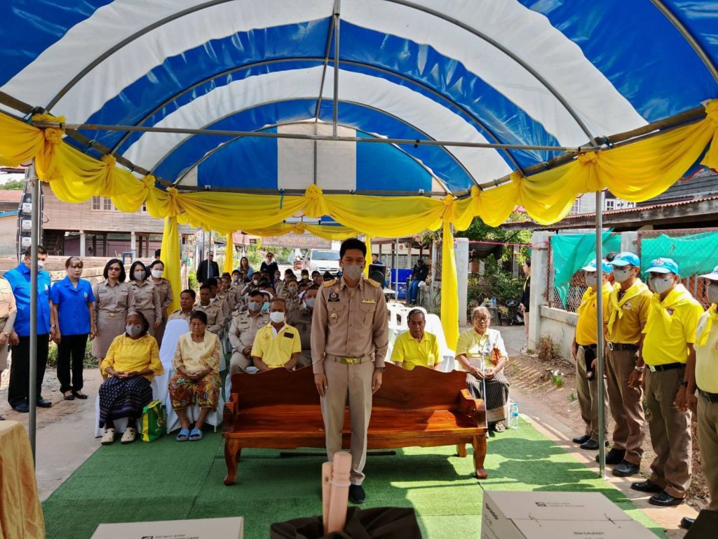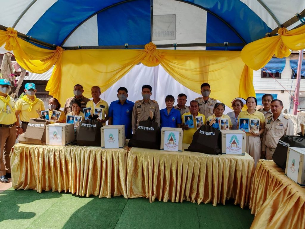 โดยมี นายกิติพันธ์ จันทร์สุข นายอำเภอบ้านฝาง เป็นประธานในพิธีมอบถถุงยังชีพพระราชทาน