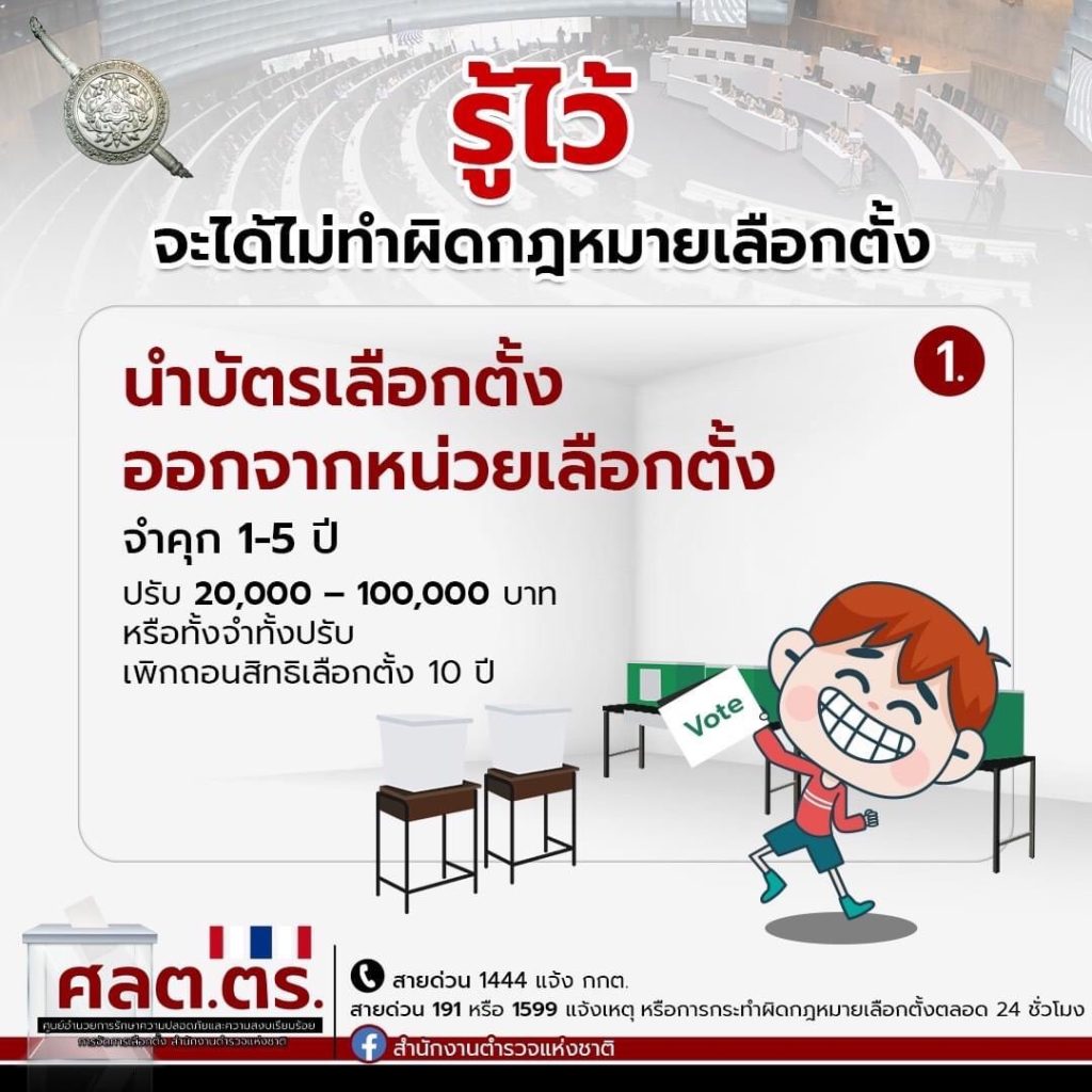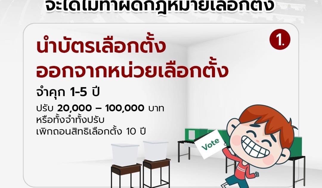 1. นำบัตรเลือกตั้งออกจากหน่วยเลือกตั้ง ฝ่าฝืนมีโทษ จำคุก 1-5 ปี ปรับ 20,000 – 100,000 บาท หรือทั้งจำทั้งปรับ และให้ศาลสั่งเพิกถอนสิทธิเลือกตั้ง 10 ปี
