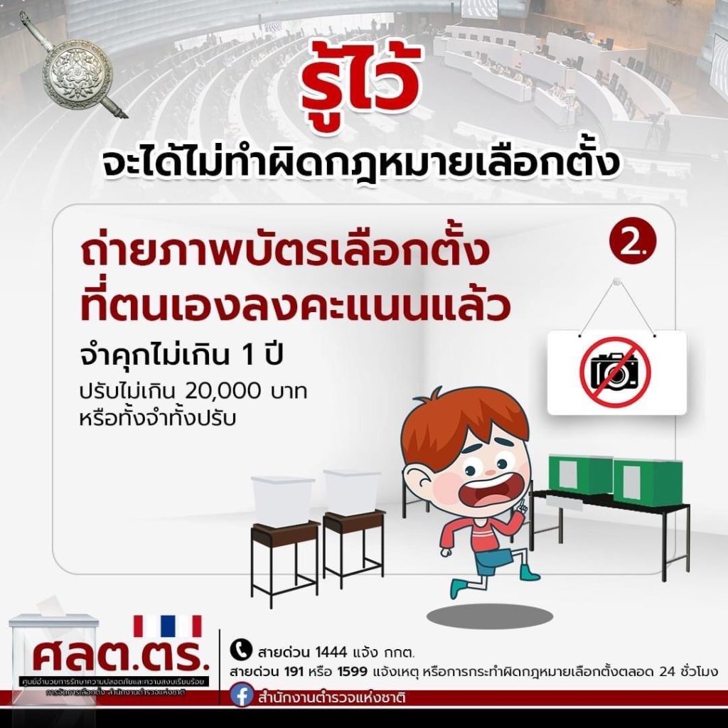 2. ถ่ายภาพบัตรเลือกตั้งที่ตนเองลงคะแนนแล้ว ฝ่าฝืนมีโทษ จำคุกไม่เกิน 1 ปี ปรับไม่เกิน 20,000 บาท หรือทั้งจำทั้งปรับ