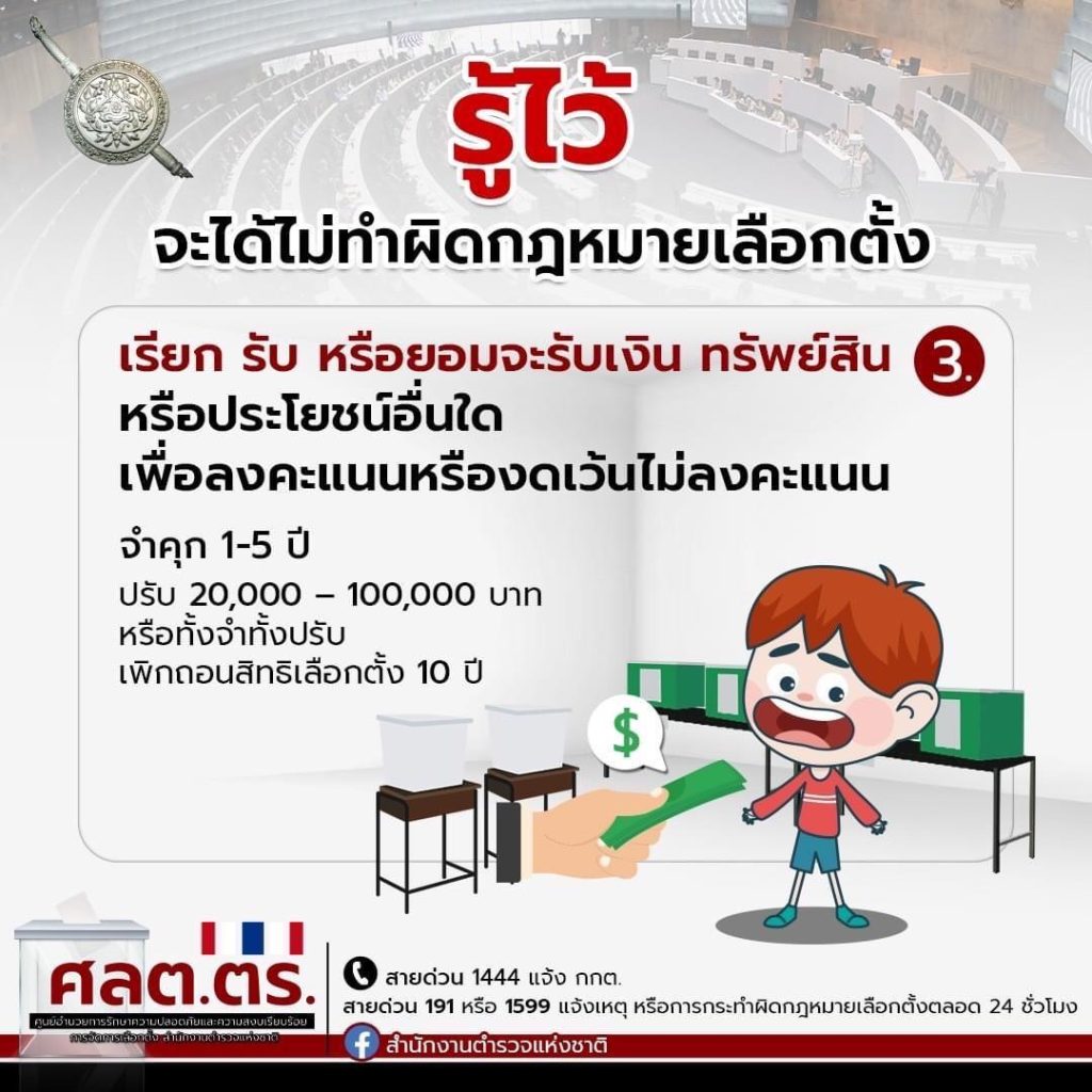 3. เรียก รับ หรือยอมจะรับเงิน ทรัพย์สินหรือประโยชน์อื่นใด เพื่อลงคะแนนหรืองดเว้นไม่ลงคะแนน ฝ่าฝืนมีโทษ จำคุก 1-5 ปี ปรับ 20,000 – 100,000 บาท หรือทั้งจำทั้งปรับ และให้ศาลสั่งเพิกถอนสิทธิเลือกตั้ง 10 ปี