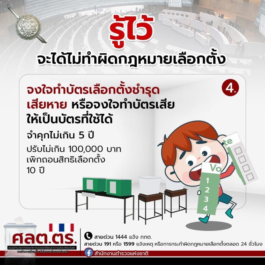 4. จงใจทำบัตรเลือกตั้งชำรุด เสียหาย หรือจงใจทำบัตรเสียให้เป็นบัตรที่ใช้ได้ ฝ่าฝืนมีโทษจำคุกไม่เกิน 5 ปี ปรับไม่เกิน 100,000 บาท และให้ศาลสั่งเพิกถอนสิทธิเลือกตั้ง 10 ปี