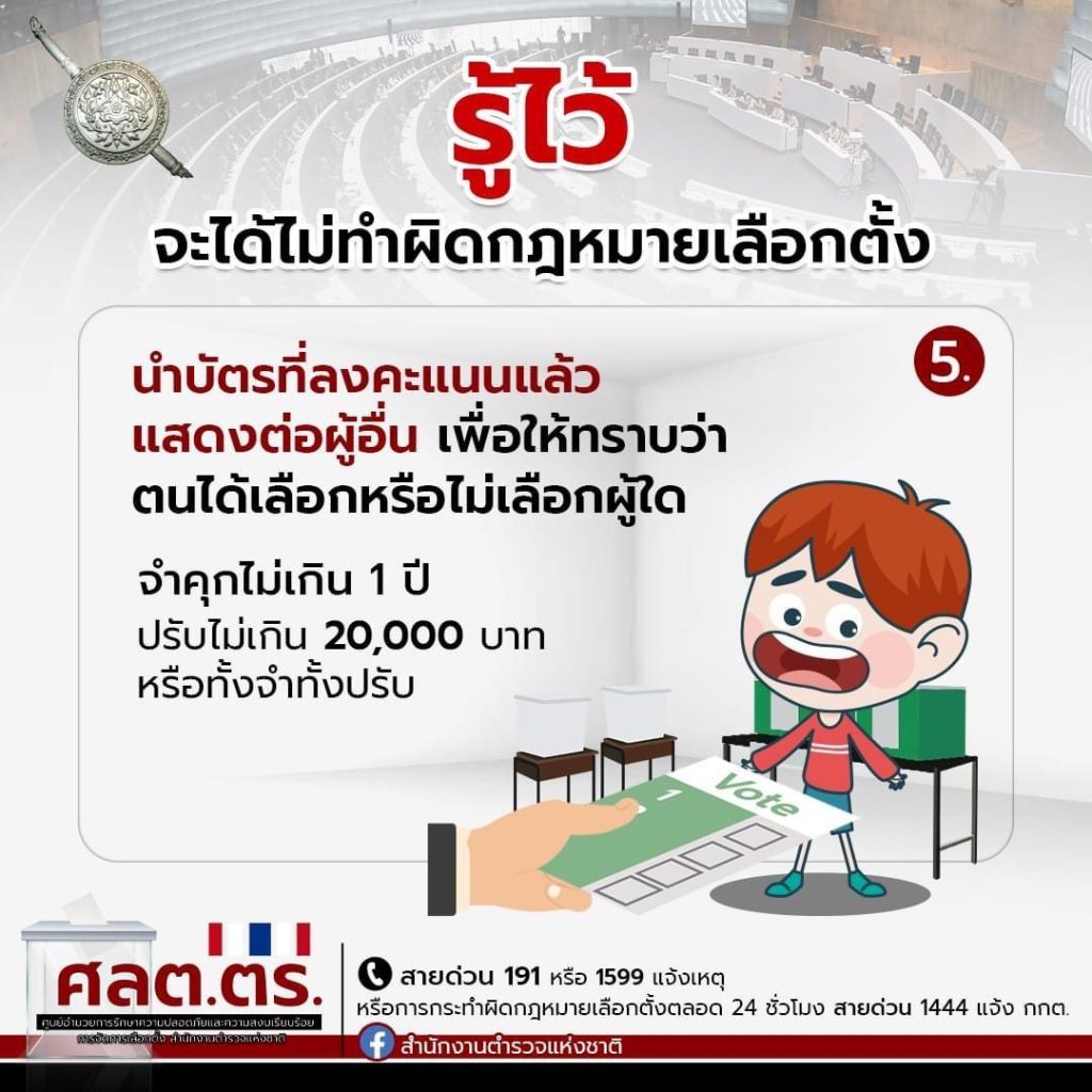 และ 5.นําบัตรที่ลงคะแนนแล้วแสดงต่อผู้อื่น เพื่อให้ทราบว่าตนได้เลือกหรือไม่เลือกผู้ใดฝ่าฝืนมีโทษ จําคุกไม่เกิน 1 ปี หรือปรับไม่เกิน 20,000 บาท หรือทั้งจําทั้งปรับ