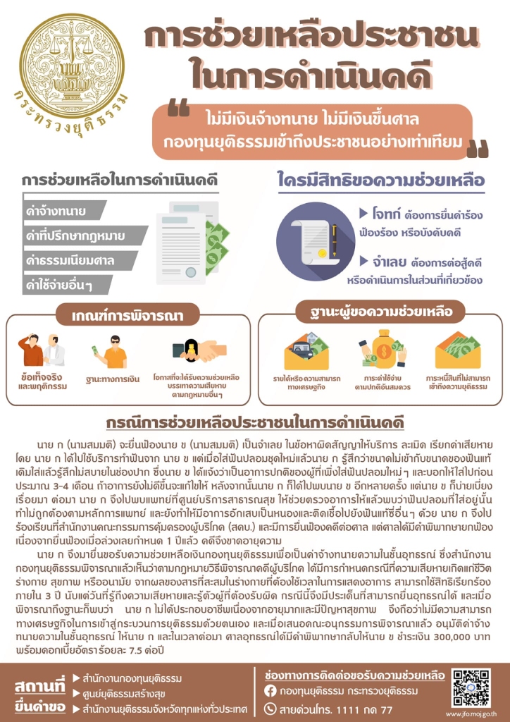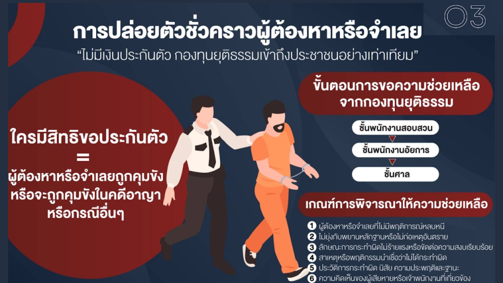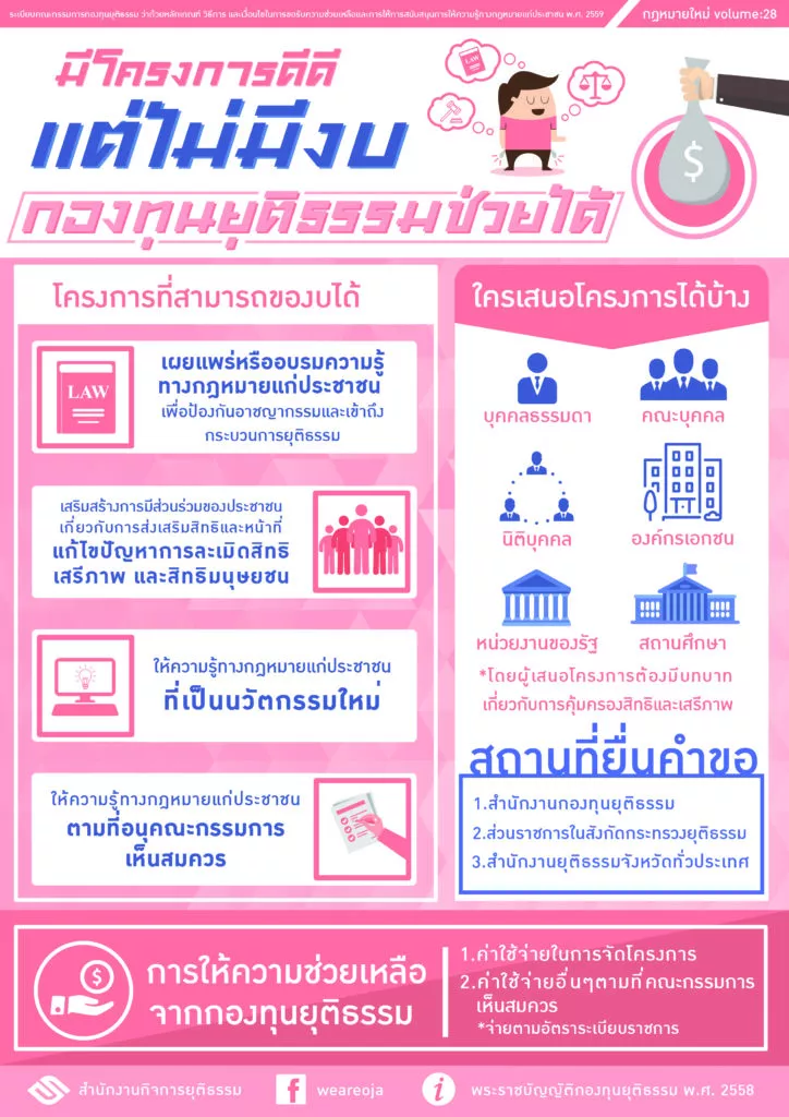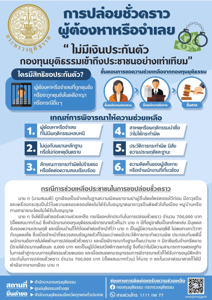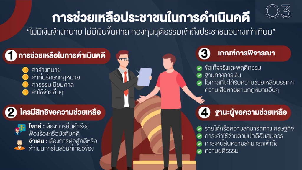 1.ช่วยเหลือในการดำเนินคดี2.ประกันตัวผู้ต้องหาหรือจำเลย3.ช่วยเหลือผู้ได้รับผลกระทบที่ถูกละเมิดสิทธิฯ4.สนับสนุนโครงการให้ความรู้กฎหมายแก่ประชาชน
