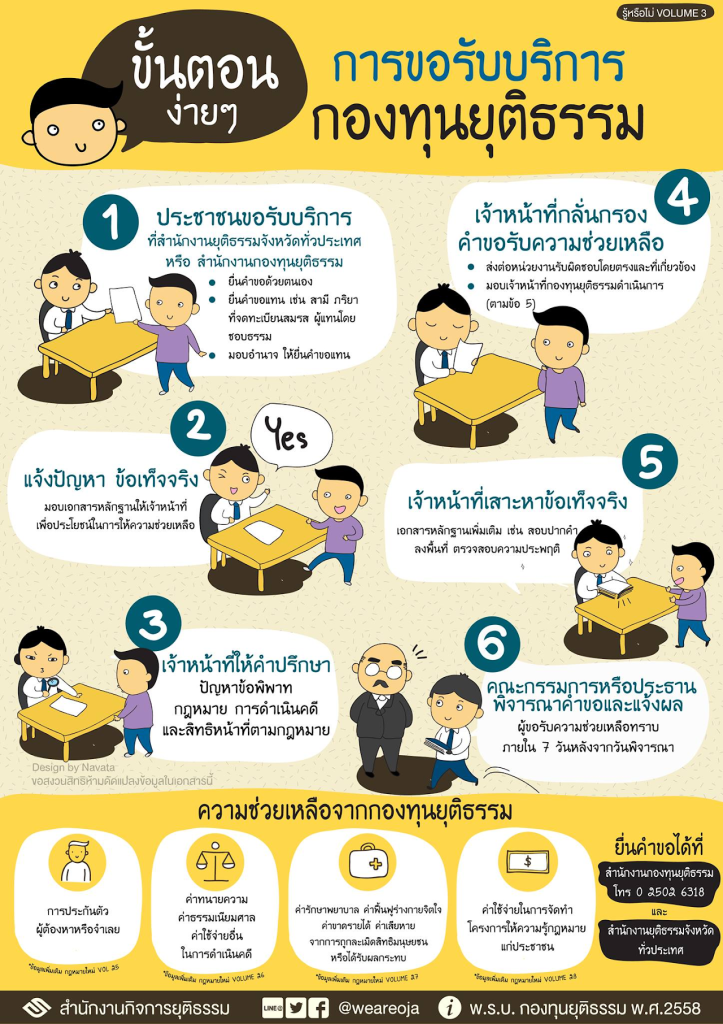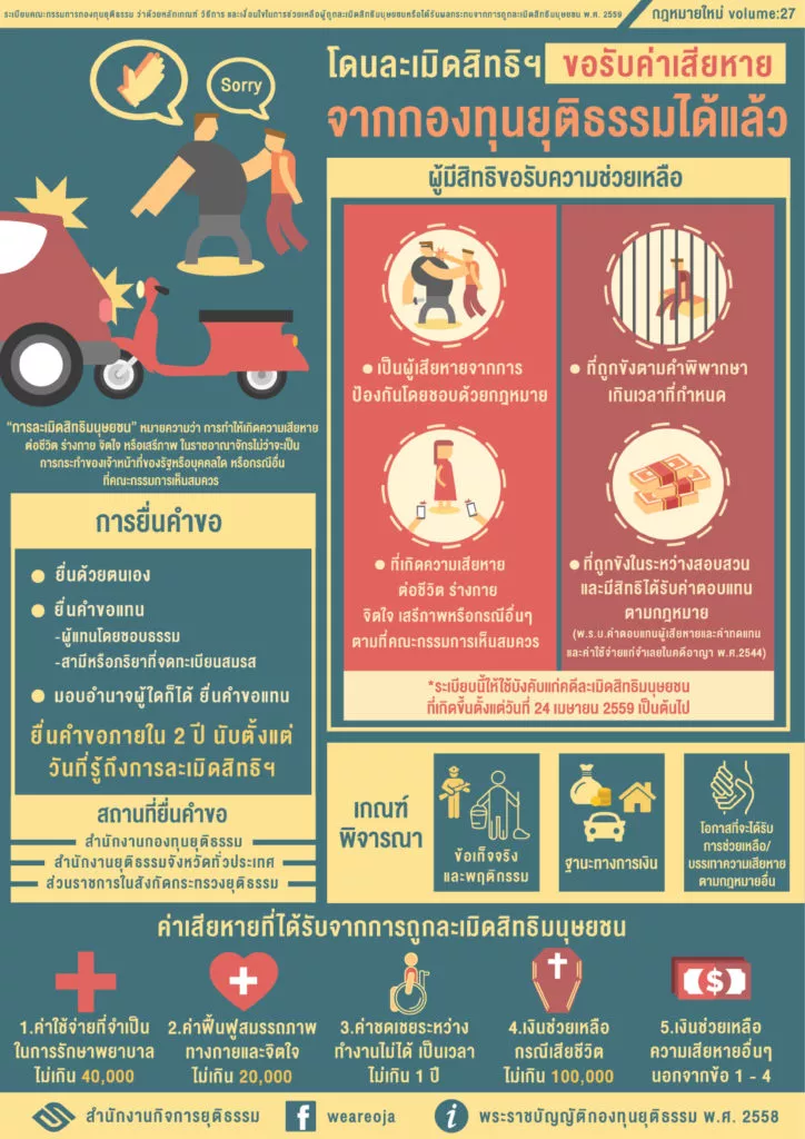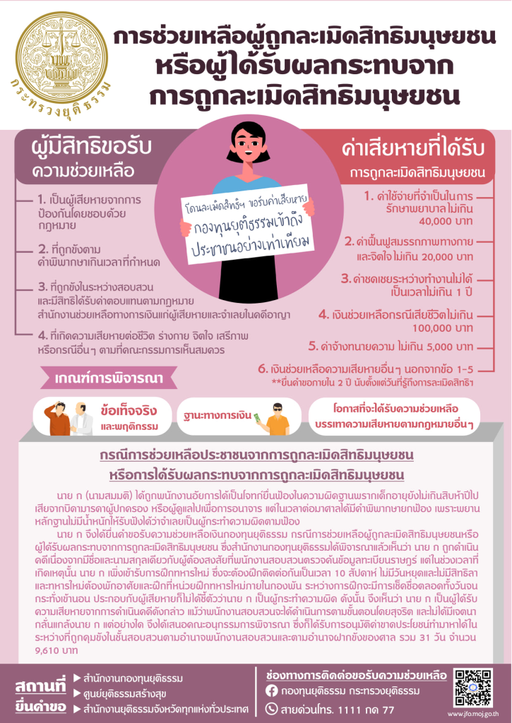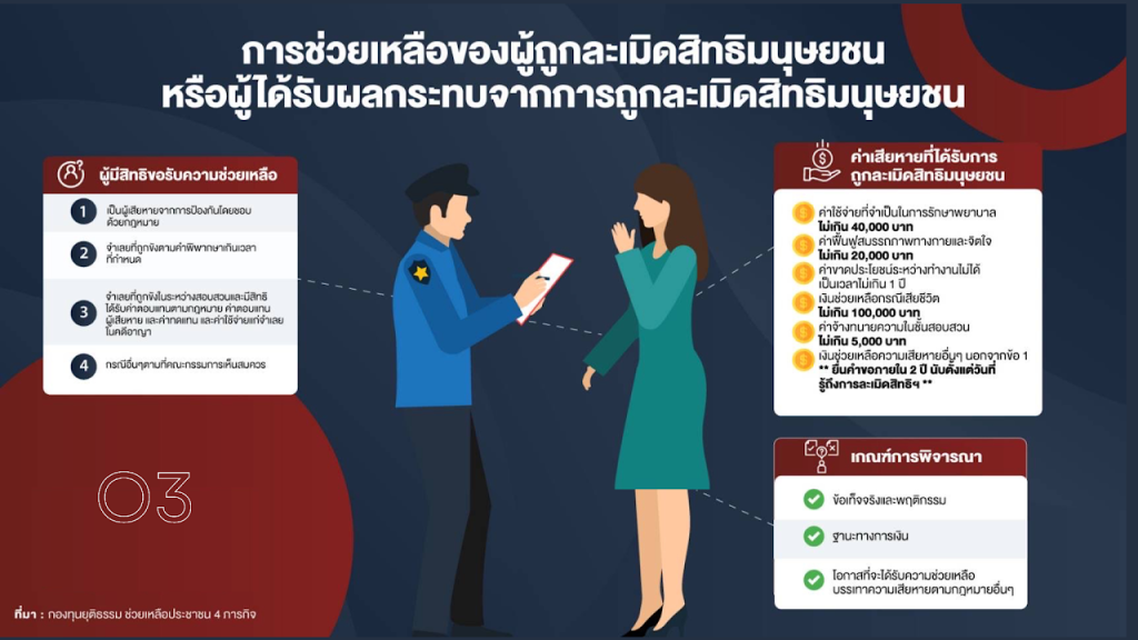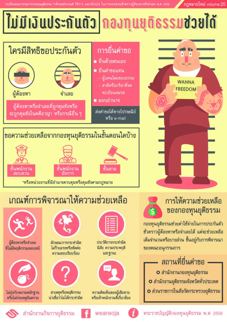 1.ช่วยเหลือในการดำเนินคดี2.ประกันตัวผู้ต้องหาหรือจำเลย3.ช่วยเหลือผู้ได้รับผลกระทบที่ถูกละเมิดสิทธิฯ4.สนับสนุนโครงการให้ความรู้กฎหมายแก่ประชาชน