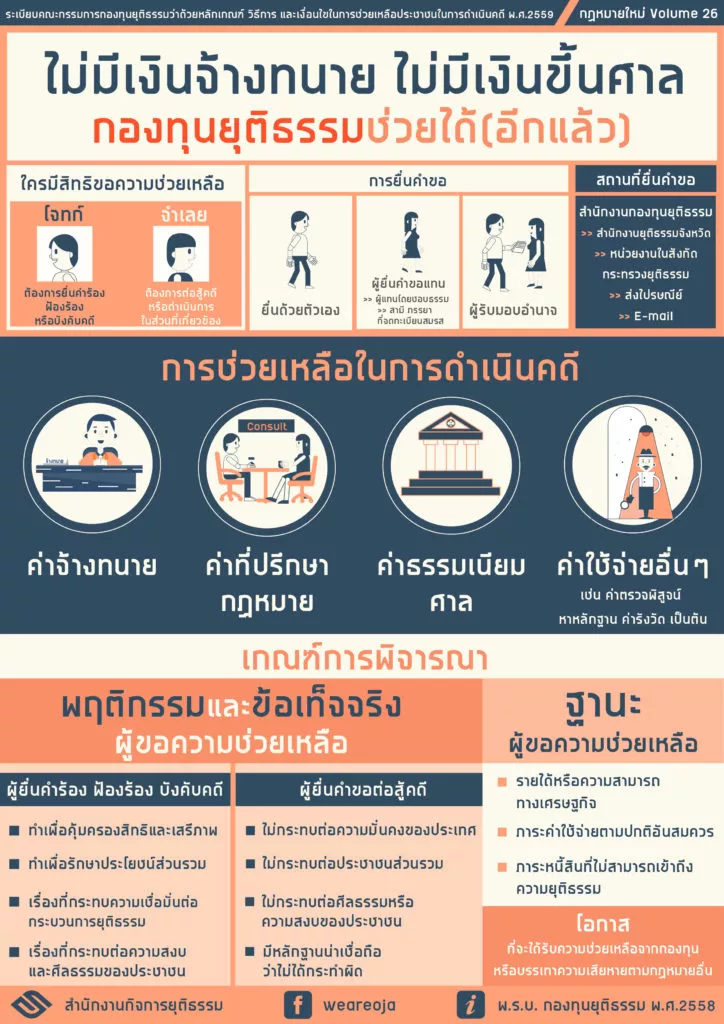 กองทุนยุติธรรม คือ กองทุนช่วยเหลือโจทก์และจำเลยในด้านค่าใช้จ่ายที่เกิดขึ้นระหว่างดำเนินคดี เช่น เงินค่าประกันตัว ค่าจ้างทนายความ โดยมุ่งให้ความช่วยเหลือผู้มีรายได้น้อยและผู้ที่เชื่อว่าไม่ได้กระทำความผิด
