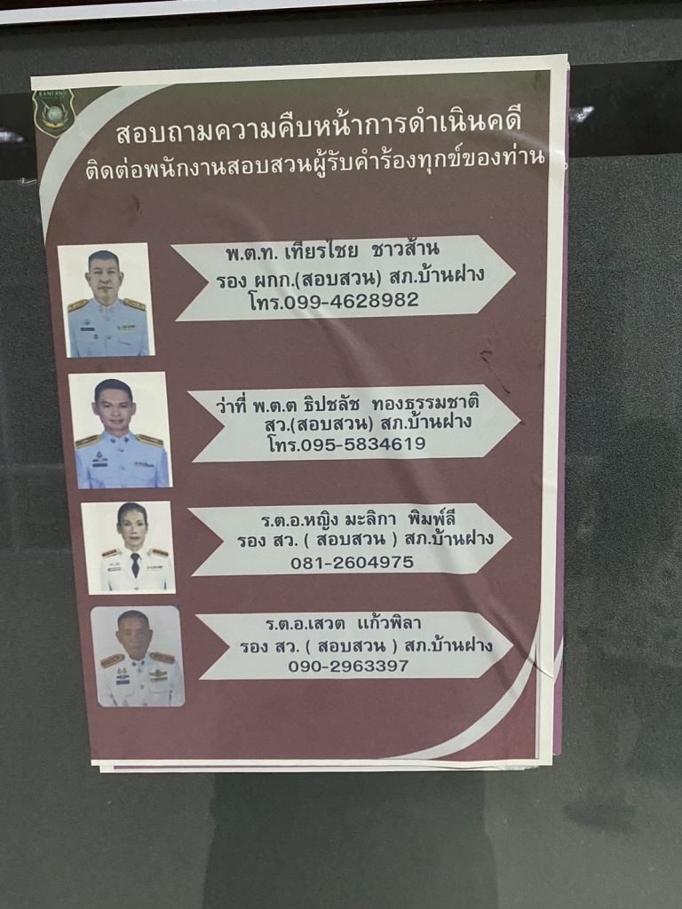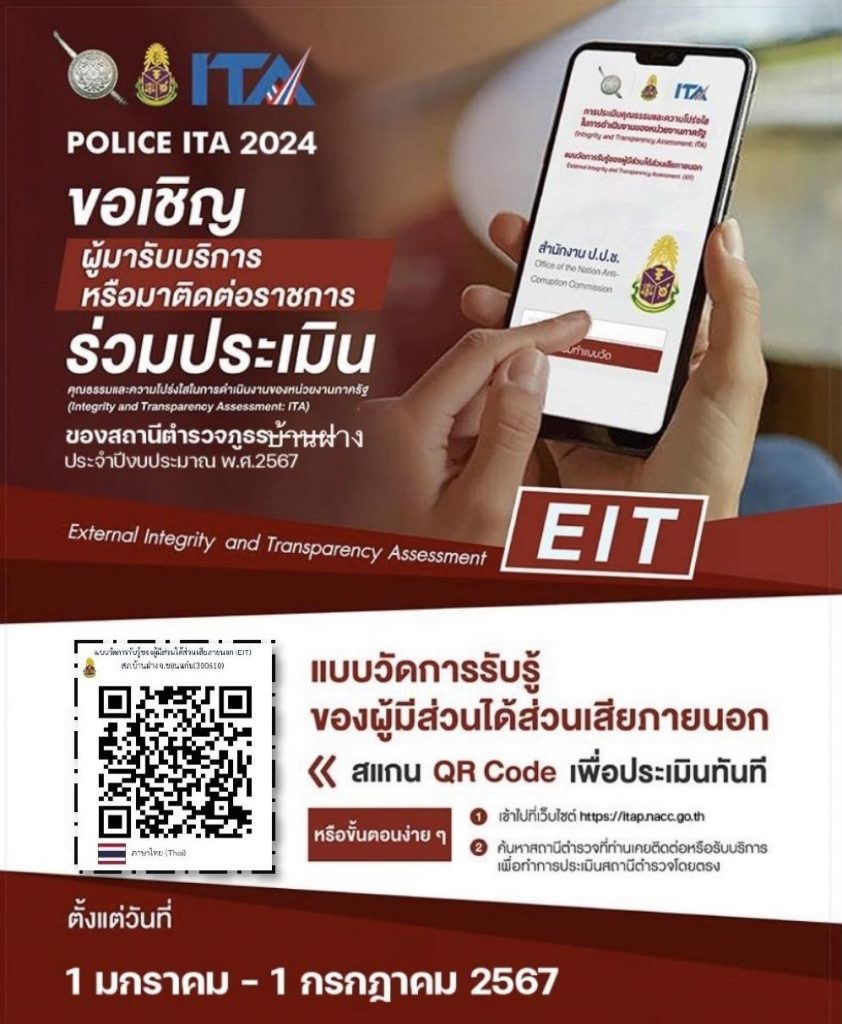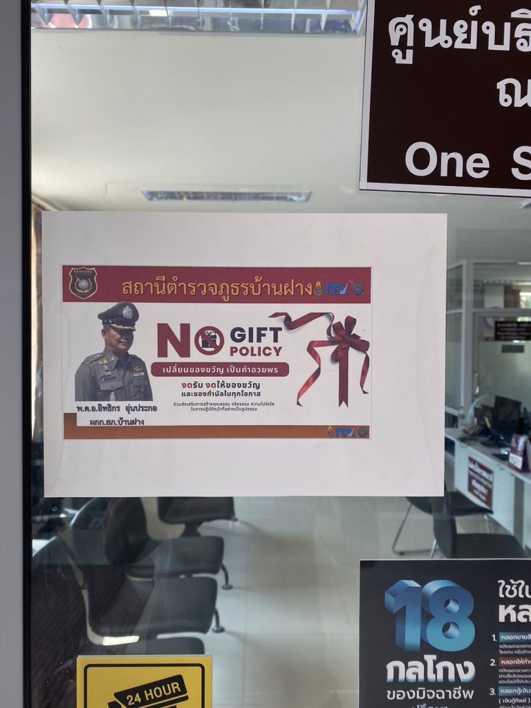 ติดไว้ในจุด บริการของสถานี เพื่อให้ประชาชนทราบว่า หน่วยงานประกาศว่าเจ้าหน้าที่ทุกคนในสังกัดไม่รับของขวัญหรือของกำนัลจากการปฏิบัติหน้าที่ และต่อต้านการรับสินบน โดยมี พ.ต.อ.อิทธิกร อุ่นประกอ สภ.บ้านฝาง หัวหน้าหน่วยงานประกาศ