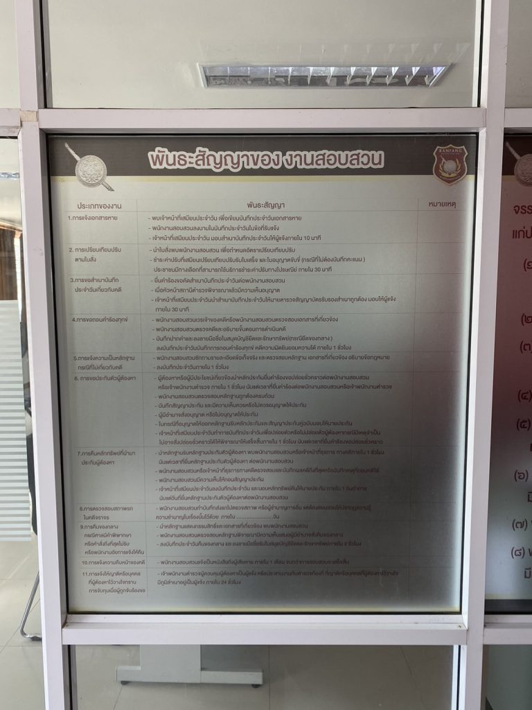 การกำหนดกรอบกิจกรรมการปฏิบัติงานของสถานีตำรวจภายใต้ระบบการทำงานและทรัพยากรที่มีอยู่ในแต่ละพื้นที่เพื่อ กำหนดเป็นพันธะสัญญาให้บริการ โดยแสดงขั้นตอนและระยะเวลาของการให้บริการของสถานีตำรวจที่ผู้มาใช้บริการควรทราบ