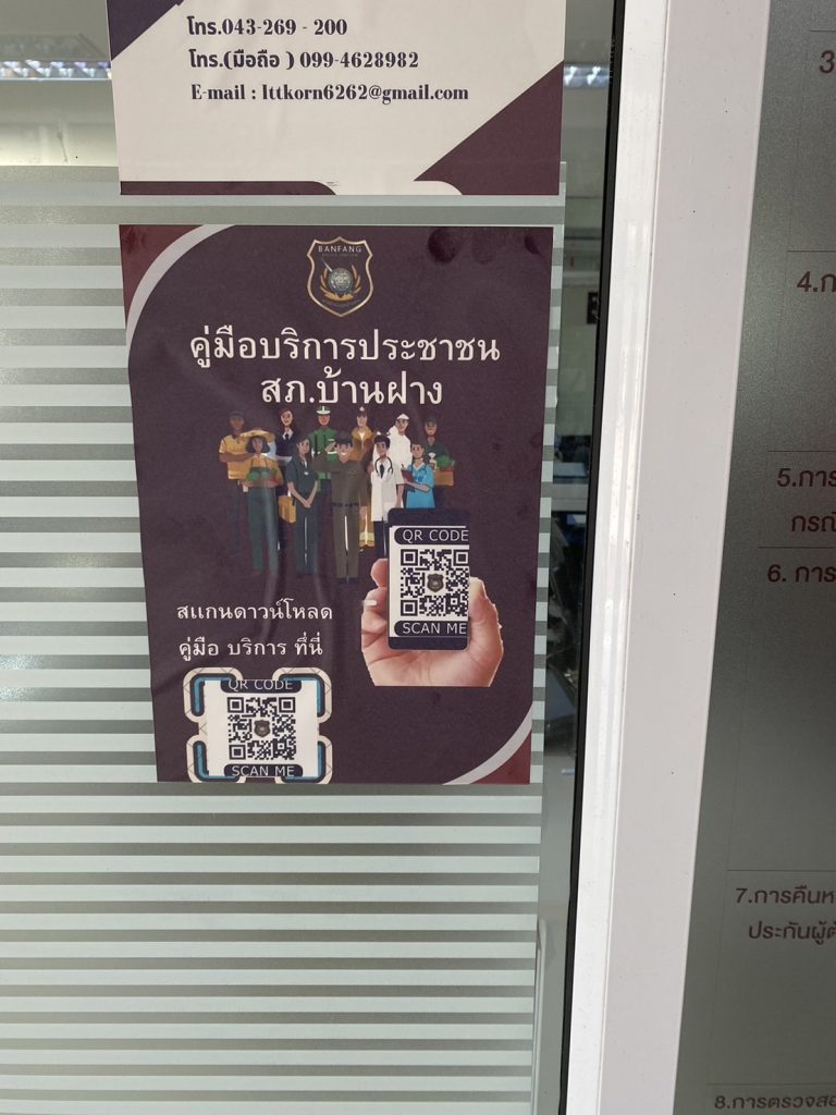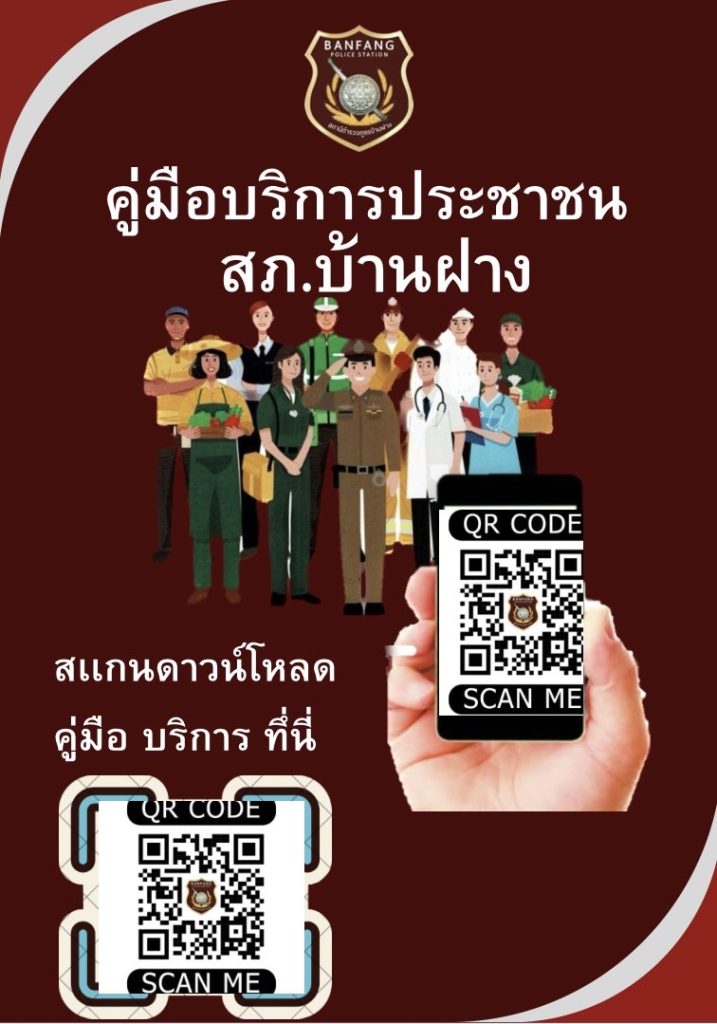 คู่มือการให้บริการประชาชนที่มาติดต่อราชการ ณ สภ.บ้านฝางสามารถ Download คู่มือบริการประชาชน ของ สภ.บ้านฝาง ได้ตามป้ายประชาสัมพันธ์ โดย QR Code จะเชื่อมโยง