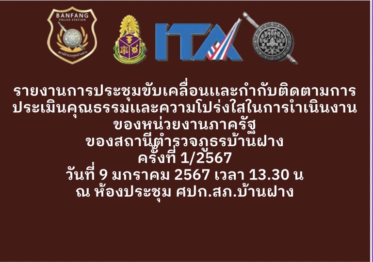 วันที่( 9 ม.ค.๖๗) เวลา 13.30 น. พ.ต.อ.อิทธิกร อุ่นประกอ ผกก.สภ.บ้านฝาง ได้ประชุมคณะทำงานขับเคลื่อนการประเมินคุณธรรมเเละความโปร่งใสในการดำเนินงานของหน่วยงานภาครัฐ ( Integrity and Transparency Assessment ITa ประจำปี 2567 เเละได้สั่งการมอบหมายหัวข้อการประเมินให้ คณะทำงานขับเคลื่อนการประเมินคุณธรรมรับผิดชอบ เเต่ละหัวข้อ